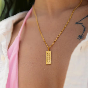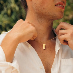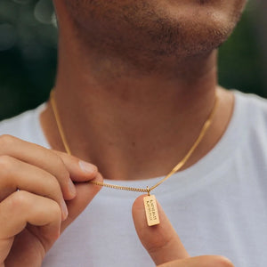A bold and meaningful accessory, the Minimalist Engraved Bar Pendant Necklace in Gold is the perfect way to showcase your individuality. Fully customizable, this necklace allows you to engrave names, initials, dates, or meaningful words, making it a one-of-a-kind piece that reflects your personal style. Crafted from high-quality stainless steel, this necklace is built for durability, with a tarnish-resistant finish that maintains its shine over time. The hypoallergenic material ensures comfort for all-day wear, making it safe for sensitive skin. Featuring a sleek and modern bar pendant, this necklace pairs effortlessly with any outfit, whether casual or formal. Designed exclusively for men, its timeless appeal makes it a standout addition to any jewelry collection.