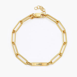 Make every moment personal with the Paperclip Bracelet with Engraving with durable gold finish. Swap up to three links for custom-engraved plates featuring names, dates, or words that matter most. Crafted from stainless steel, this Gold Engraved Bracelet offers lasting shine and comfort. Its adjustable design and lobster clasp ensure a perfect fit for any wrist.